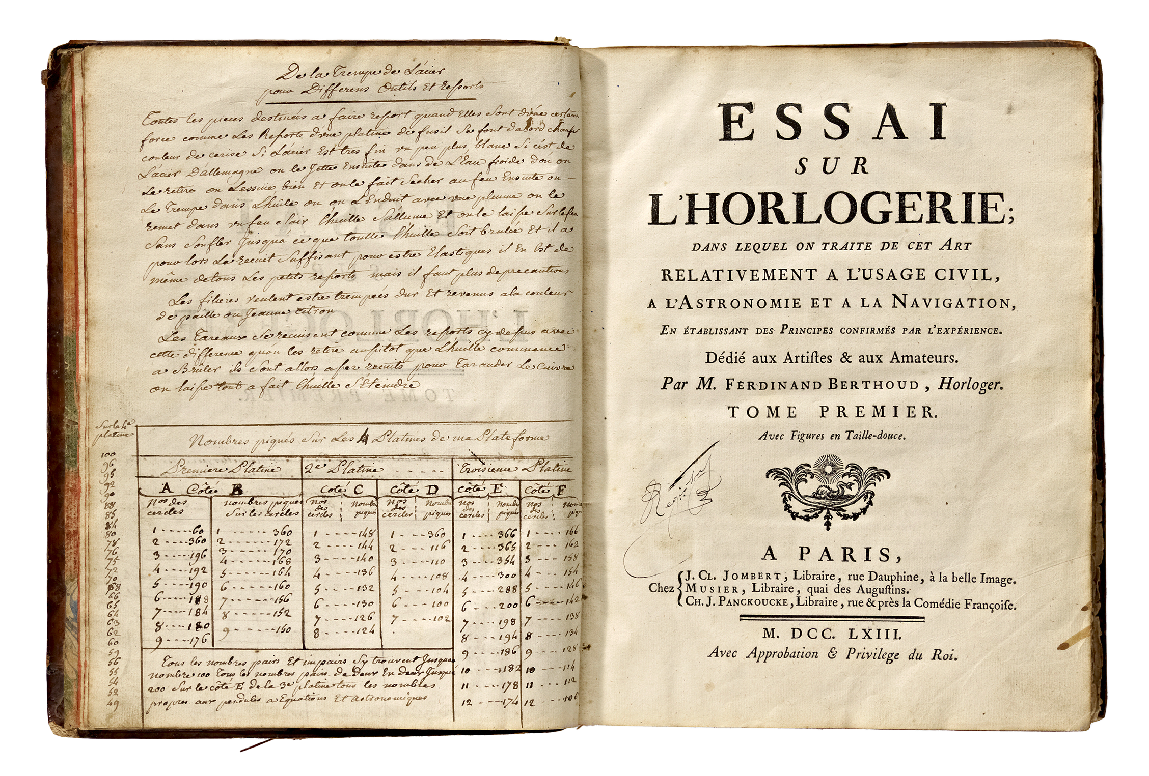"Essai sur l'Horlogerie" (essay on horology), in which its civilian use and its applications in astronomy and navigation are examined, while establishing principles confirmed by experiment. (Volume I: 477 pages + 5 tables, volume II: 452 pages + 38 plates)