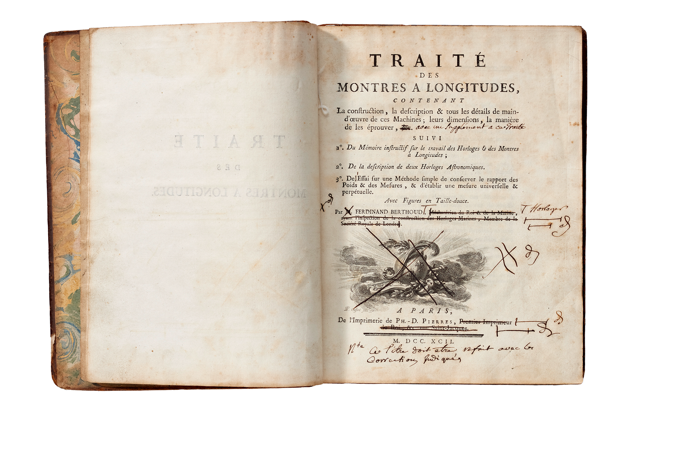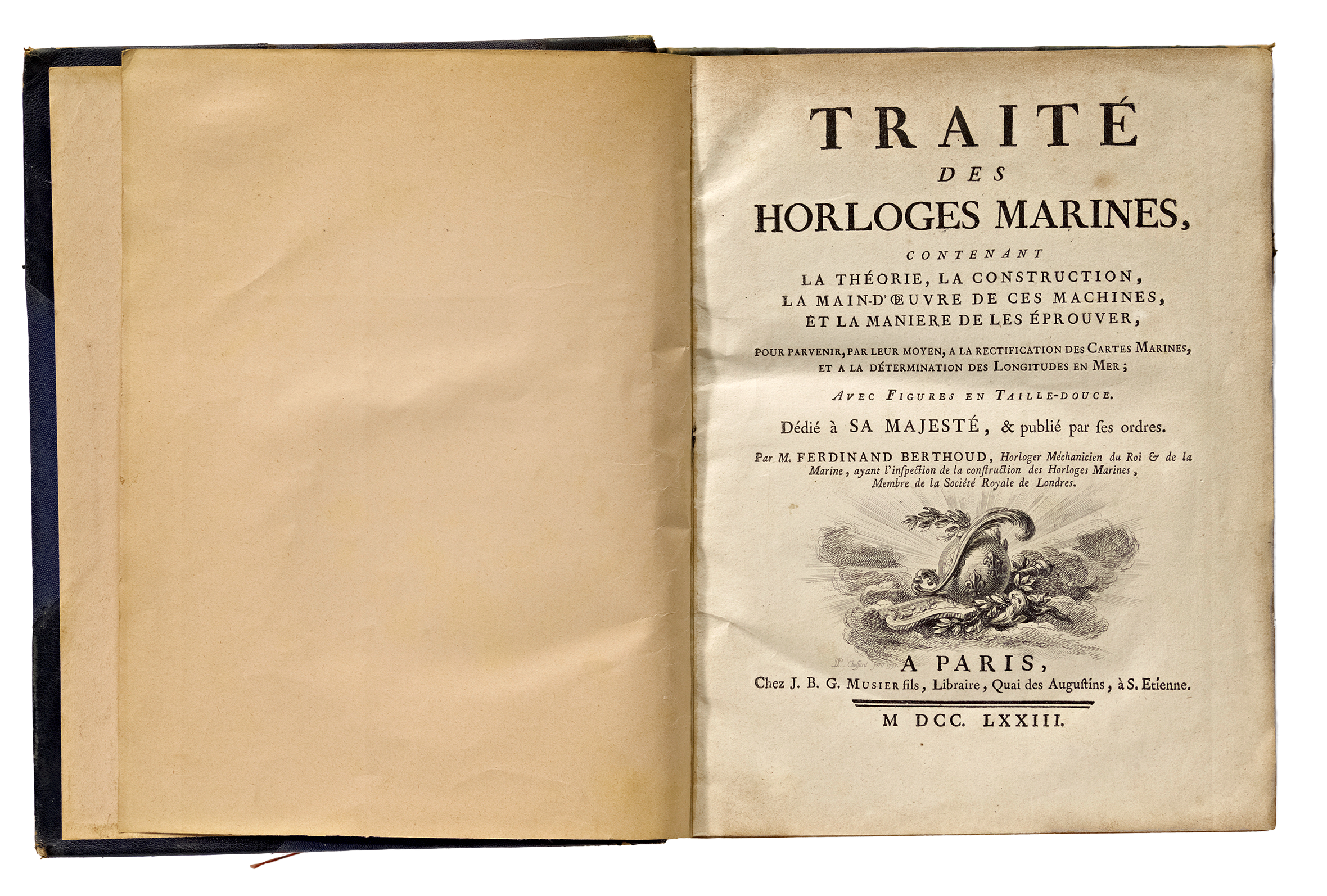 "Traité des horloges marines" (Treatise on marine chronometers) covering the theory, construction and the makers of these instruments as well as the method of rating them so that they can used to correct charts and find longitude at sea. (590 pages + 27 planches)