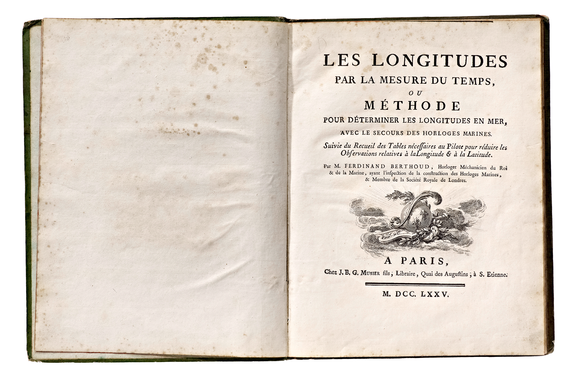 "Les longitudes par la mesure du temps ou méthodes pour déterminer les longitudes en mer avec le secours des horloges de marines" (Longitude by time measurement, or a method of finding longitude at sea with the aid of marine chronometers), followed by the appropriate sight-reduction tables to calculate longitude from celestial observations.(96 pages + 34 tables + 1 planche)