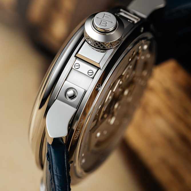 Chapter 1 of the "Mesure du Temps 1787" collection presents the first model featuring a mechanical architecture on full display : Chronomètre FB 2TV. Its movement is the successor to the original Calibre FB-T.FC unveiled in 2015. The new Calibre FB-TV.FC uses the same regulating principle as its predecessor, while incorporating a flying tourbillon and enhanced with two complications: stop‑seconds and a central seconds flyback reset via via a crown-integrated pusher.