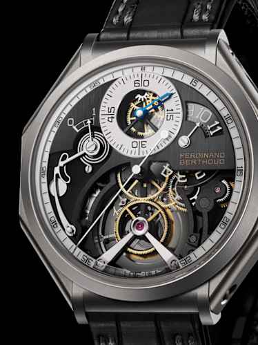 Ce Chronomètre Régulateur à tourbillon et fusée-chaine est le fruit d’un développement technique et esthétique complet et s’inspire de l'Horloge de Marine N° 8, produit par le maître horloger à Paris en 1768. Le cadran en maillechort traité PVD noir décoré de trait tirés présente trois ouvertures : les heures à 2h, les minutes à 12h et la réserve de marche à 10h. La production de ce mouvement se limitera strictement à 20 exemplaires où le choix d’habillage reviendra au collectionneur. Le FB 1RS.6 doté d’un boîtier octogonal en acier cémenté représente une des variations proposées par la manufacture.