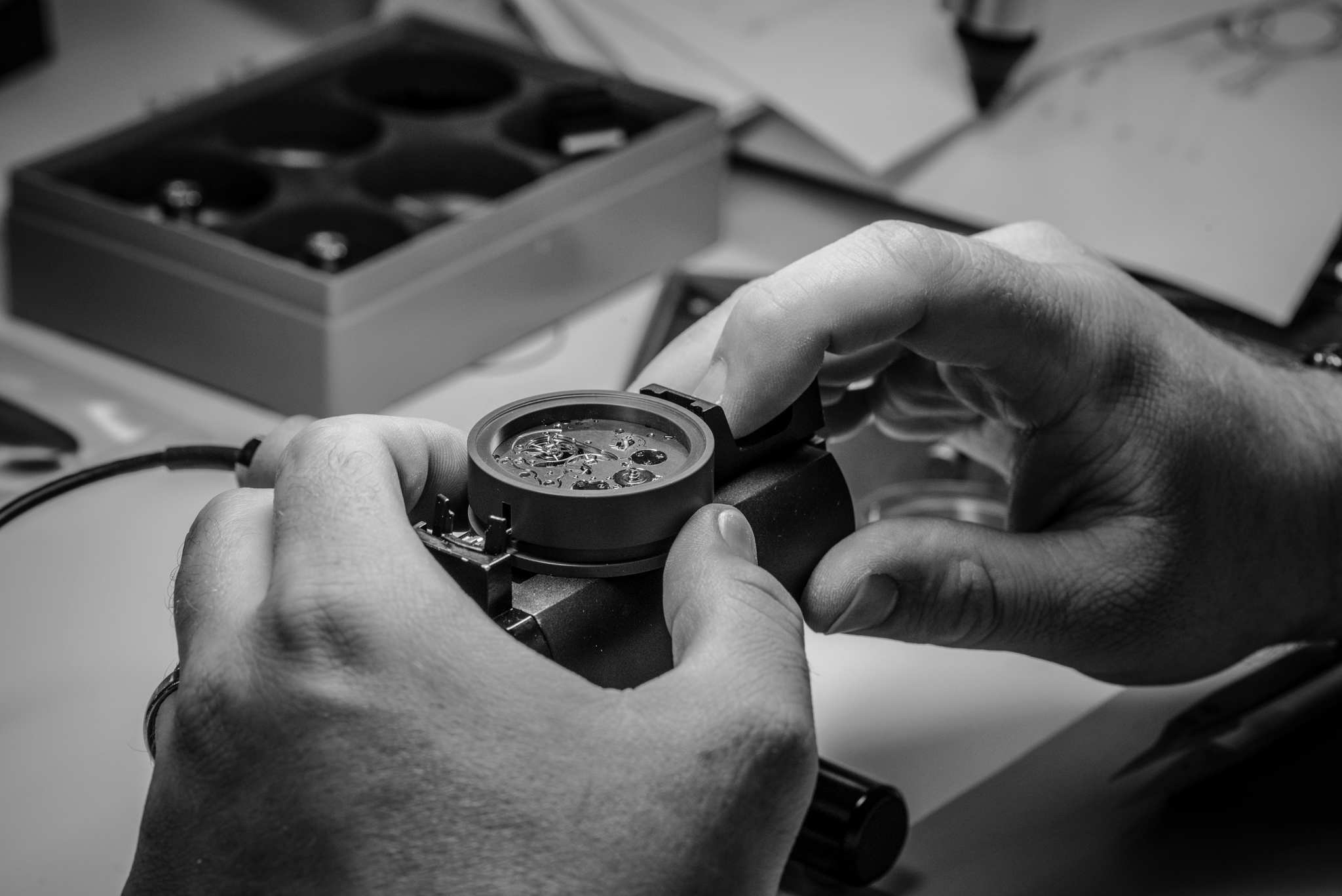 La construction du boîtier ne répond à aucun standard horloger. De facto, elle ne pouvait se faire avec des outils génériques. Pour cette raison, la Chronométrie Ferdinand Berthoud a elle-même conçu la plupart de ses outils destinés à l’assemblage manuel du modèle FB 1. C’est là une exigence de bienfacture doublée d’un respect patrimonial : Ferdinand Berthoud lui-même fabriquait ses propres outils, comme en attestent ses nombreux traités horlogers.