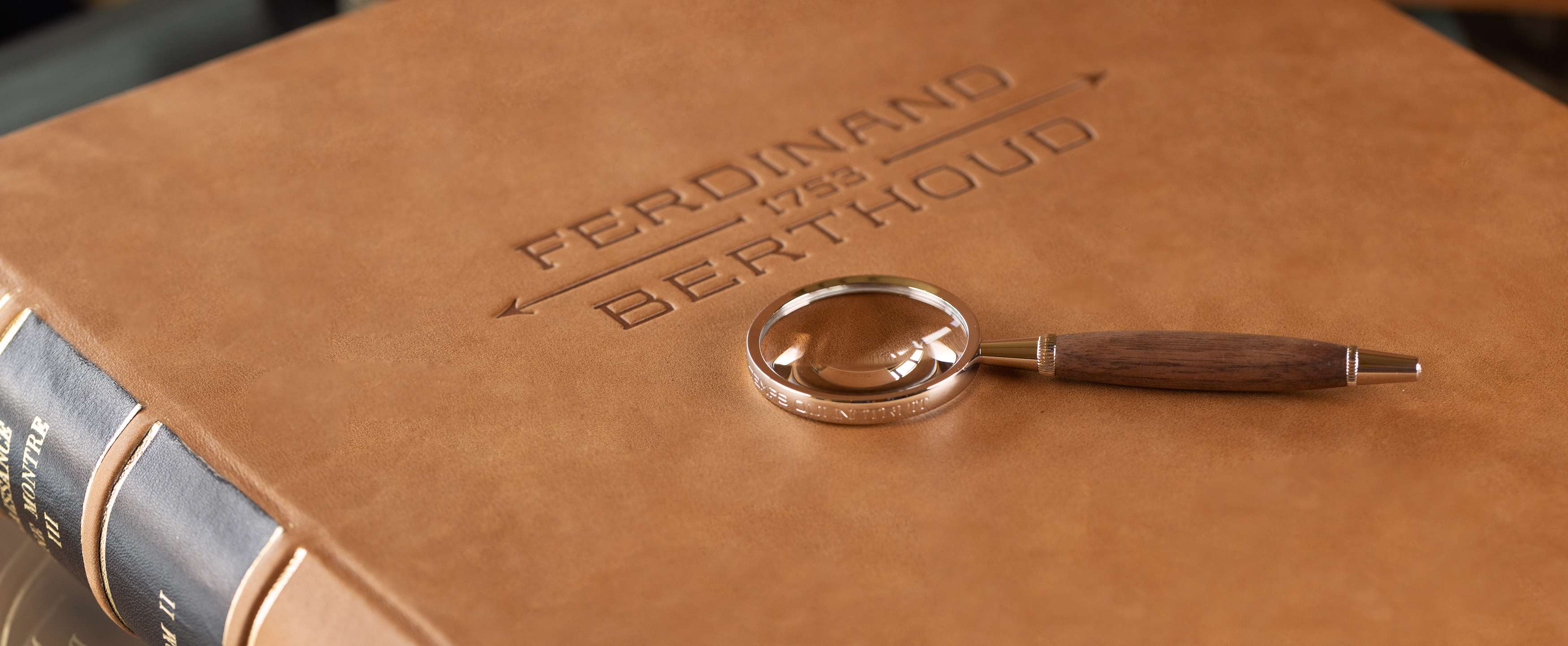 Le premier tome est destiné à accueillir la montre et l’ouvrage que vous tenez entre les mains, relatant les principales étapes de sa fabrication. Le second tome renferme les certificats d’origine, de garantie et de chronométrie de la montre, signés de la main de Monsieur Karl-Friedrich Scheufele, président de la Chronométrie Ferdinand Berthoud. Il contient également une loupe de facture exceptionnelle en argent, une pochette de voyage en cuir de veau bleu, une clé USB en forme de maillon de chaîne sur laquelle figurent le mode d’emploi et d’entretien de la montre traduits en plusieurs langues, un tissu en coton de très haute qualité pour nettoyer la montre et une paire de gants.