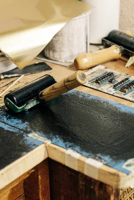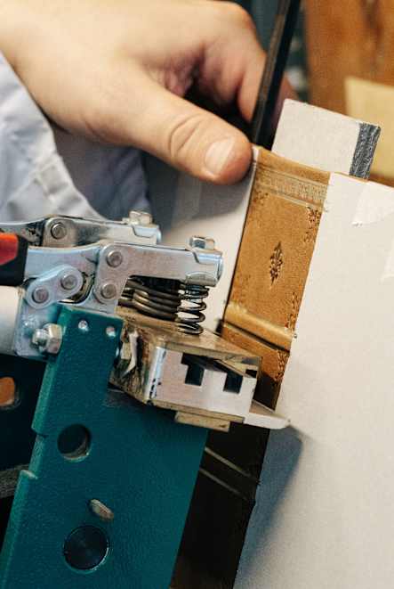 - Le processus de fabrication commence par la découpe des matériaux. S’ensuit l’assemblage de la structure en bois, traitée avec un vernis à l’eau, et de la contre-boîte en carton. L’extérieur de l’écrin est ensuite gainé de cuir, telle la reliure d’un livre. Le dos du livre est marqué au fer chaud de lettrages et décors, dont certains sont gaufrés et dorés.