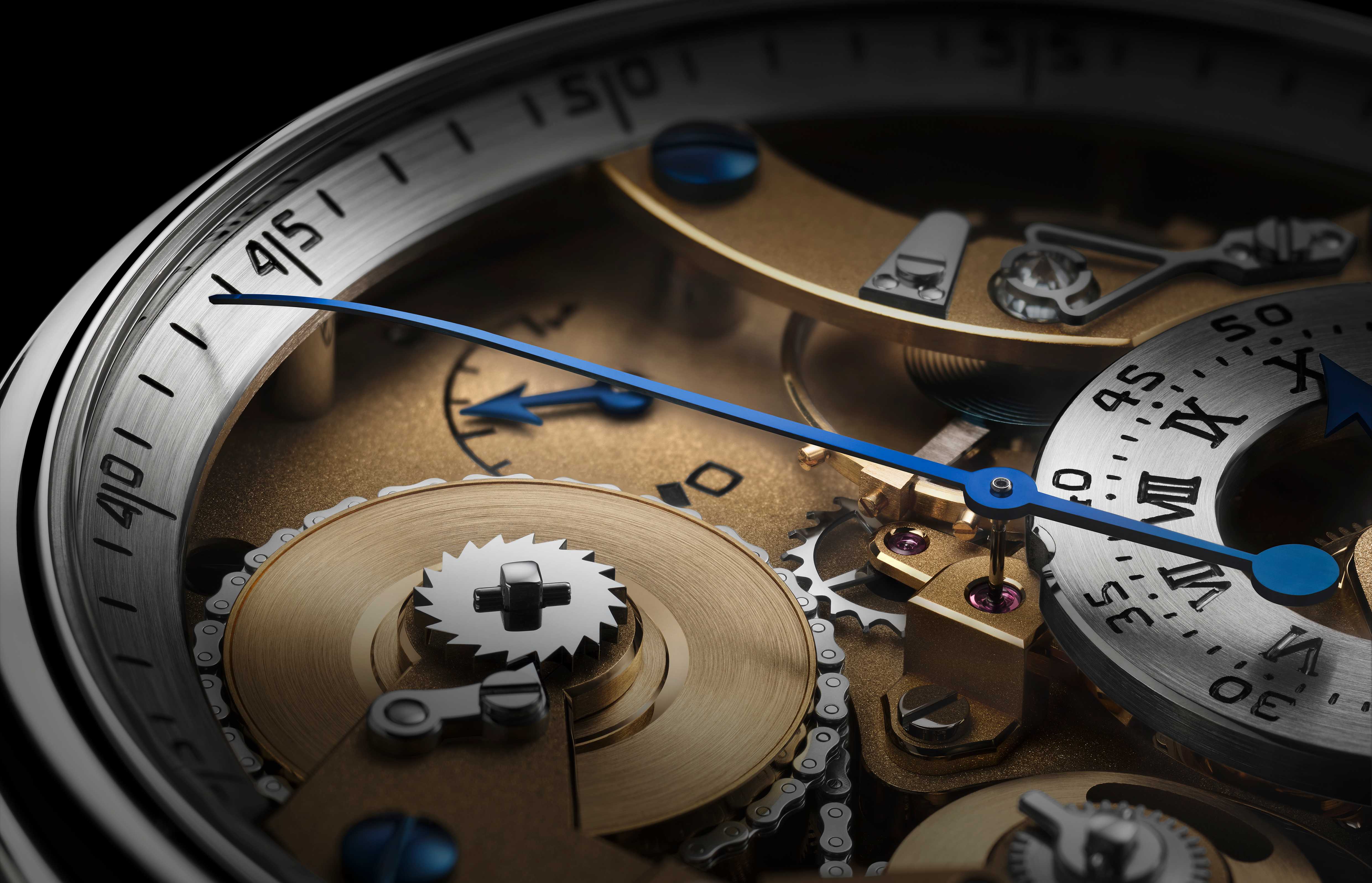 • L’aiguille filaire des secondes et celle de l’indication de la réserve de marche sont portées par des canons (cylindres percés) en or 18 carats, réalisés par décolletage sur un tour. Les canons permettent de chasser (fixer) les aiguilles sur les pivots de leurs mobiles respectifs. L’emploi de canons est nécessaire pour fixer ces deux aiguilles, qui doivent être posées sur des pivots de faibles dimensions. Les aiguilles des heures et des minutes sont, quant à elles, directement percées et fixées à leurs mobiles respectifs